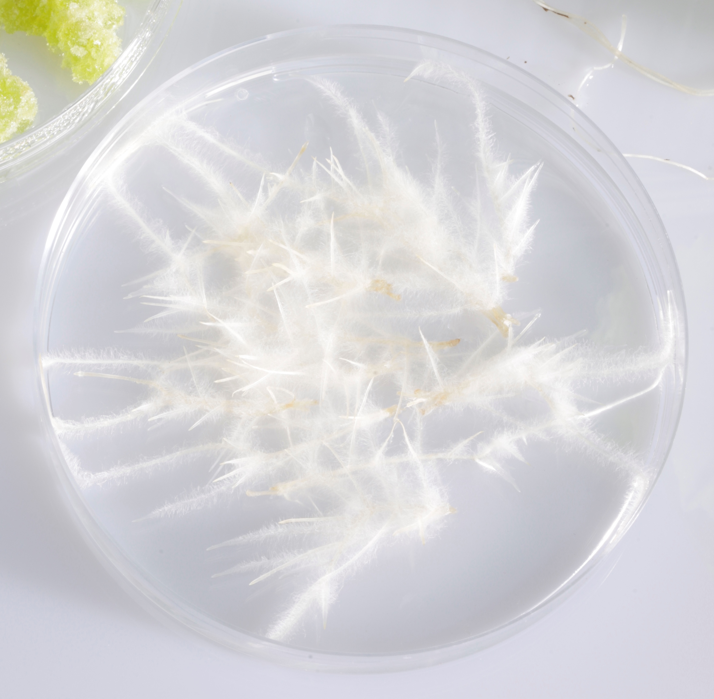 Another way to make plant cells produce specific target metabolites is the induction of hairy root cultures. This involves the use of a natural soil pathogen that infects the roots and colonizes them, causing rapid and unregulated growth (resulting in many additional root hairs, hence the name “hairy roots”). Hairy roots can be grown independently and indefinitely in culture, allowing the continuous production of valuable metabolites. Although hairy roots cannot be cultivated at the same scale as plant cell suspension cultures, they remain stable for longer in culture and produce more biomass, which maximizes their ability to produce target compounds.