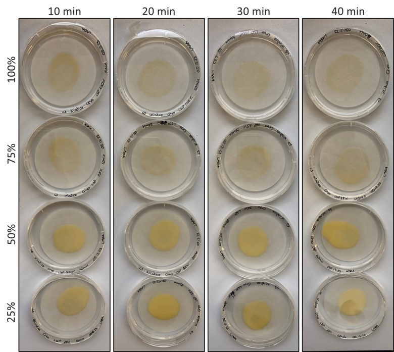 Cryopreservation and storage methods that preserve biomass accumulation and the production of metabolites were evaluated for several of the species in the InnCoCells portfolio. Reserve stocks of plant cells can be kept in the freezer and used to start new production campaigns, but only if they remain viable during long-term cold storage. This process, known as cryopreservation, must be rigorously tested. The picture below shows cryopreservation tests for cells of the tropical shrub Waltheria indica, revealing the effects of different concentrations of the cryoprotectant and the duration of the procedure. Image credit: VTT