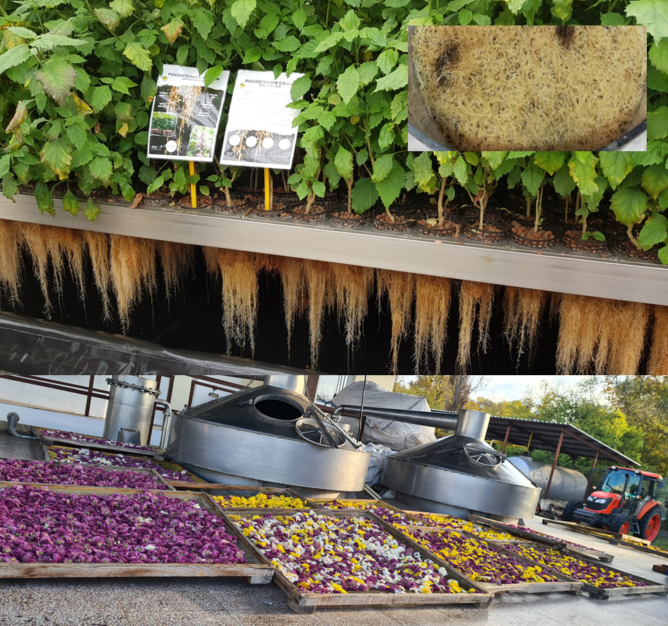 The picture below shows other sources of biomass in the project: the roots of plants grown in aeroponic systems, in this case Pogostemon cablin (top), hairy root cultures, in this case basil (top, inset), and the floral components of plants grown in the field, in this case chrysanthemum (bottom). Image credits: PAT, EVO and ECOM