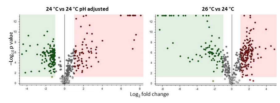 More than 100 hydrophilic and lipophilic extracts have been tested for a wide range of properties including anti-inflammatory, anti-aging, antioxidant and antimicrobial activities. The chemical composition of extracts showing the most promising cosmetic-related bioactivities has been assessed in detail using a combination of targeted and untargeted metabolomics. The picture below shows that even small changes in culture conditions can have a big effect on the metabolites produced by plant cell cultures. The distribution of polar metabolites in chili cell cultures grown at different temperatures is shown with or without pH adjustment in a volcano plot. The red dots are metabolites that are enriched and the green ones are depleted. The InnCoCells project aims to find culture conditions that favour the production of bioactive metabolites that are suitable as cosmetic ingredients. Image credit: ENEA